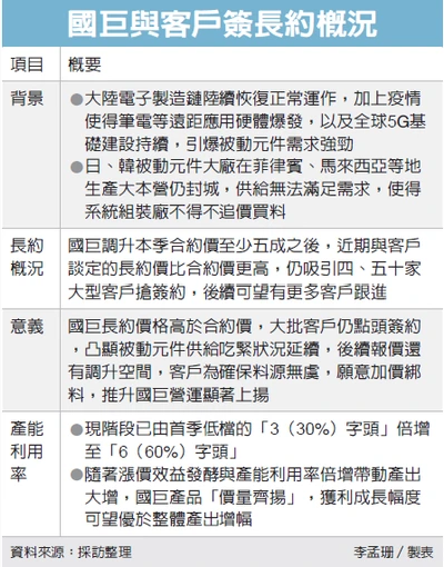 合約價是每月或每季調(diào)整,長約期限通常至少一年,享有「長程經(jīng)濟」,一般都會低于合約價平均,讓客戶享有一些優(yōu)惠。此次國巨長約價格高于合約價,大批客戶仍點頭簽約,凸顯被動元件供給吃緊狀況延續(xù),后續(xù)報價還有調(diào)升空間,客戶為確保料源無虞,愿意加價綁料。