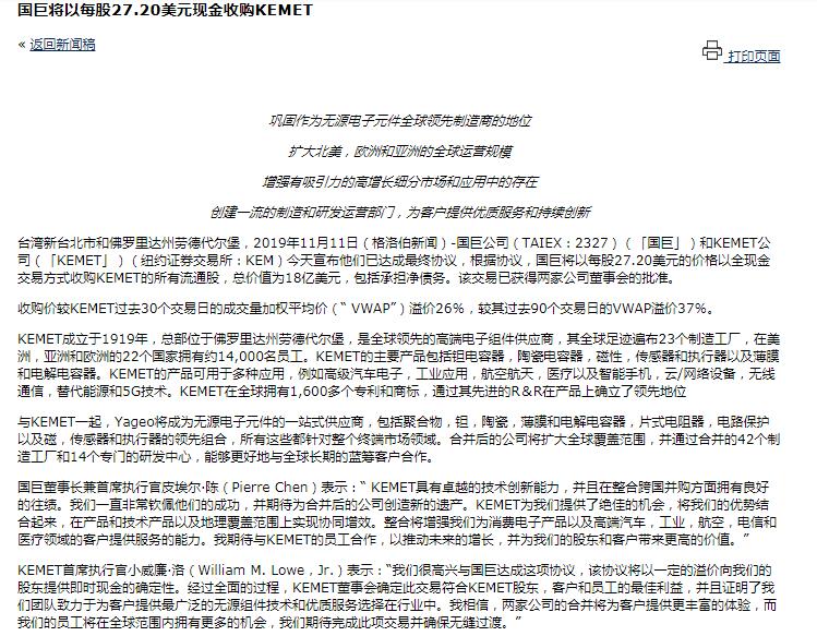 根據(jù)基美官網(wǎng)披露的消息,該交易預(yù)計(jì)將在2020年下半年完成,但要符合慣例完成條件并獲得所需的監(jiān)管批準(zhǔn),交易完成后,基美將成為國巨的全資子公司